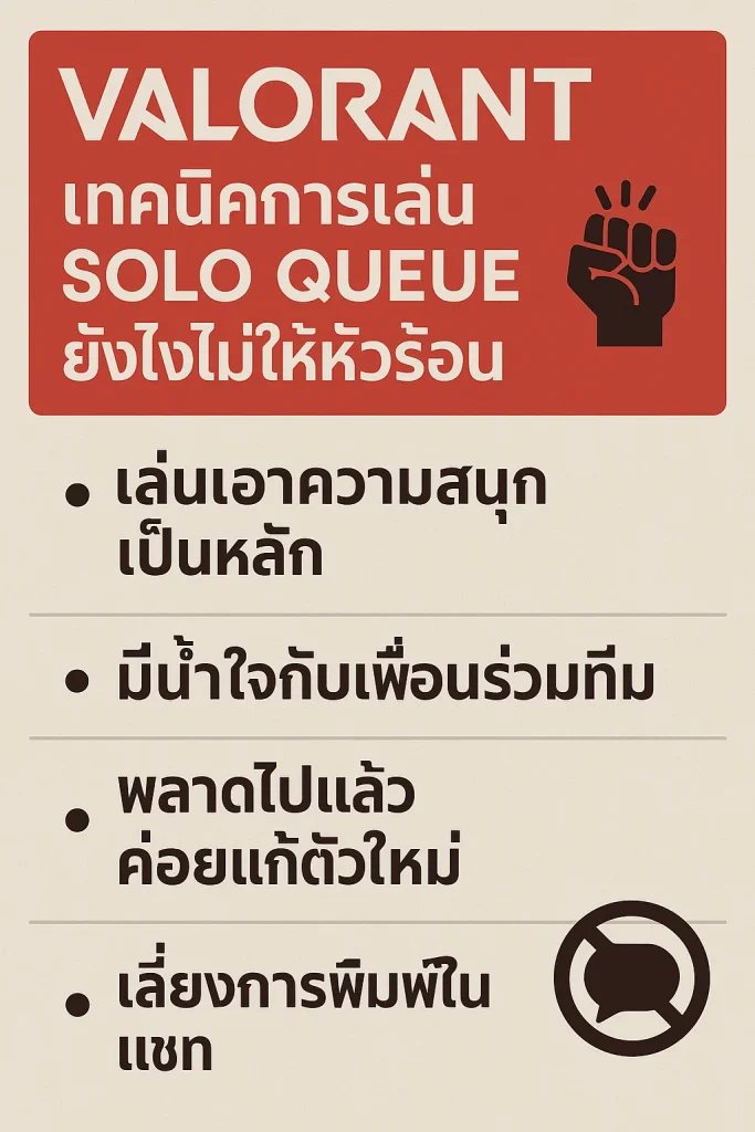 การเล่น Solo Queue ใน Valorant อาจเป็นสนามที่เต็มไปด้วยความกดดัน แต่ถ้าคุณมี Mindset ที่ถูกต้อง, รู้จักสื่อสาร, จัดการเครดิต, ฝึก Aim และควบคุมอารมณ์ คุณจะสามารถเล่นได้อย่างสนุกและไม่หัวร้อน แถมยังมีโอกาสไต่แรงก์ขึ้นจริง